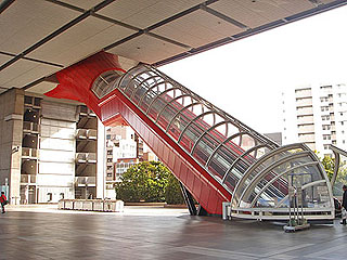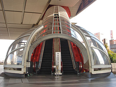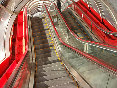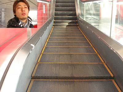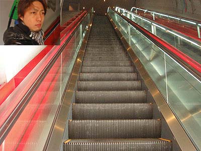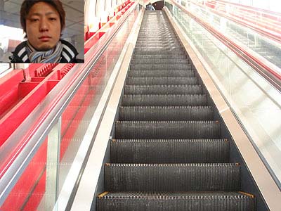 説明すると、広場にチケット売り場がありまして、このエスカレーターはその広場と博物館の入り口を結ぶエスカレーターです。この入り口の横に係りの人が立ってまして、入場チケットを見せないとエスカレーターに乗れない仕組みになっています。・・・ん?