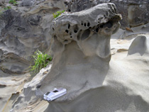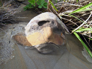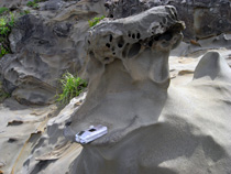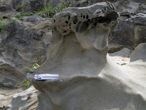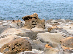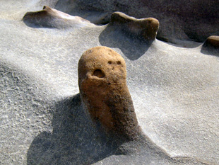 ウネウネしているだけではなくて、岩は波で浸食されて細かい穴があいている。その穴がついうっかり顔に見えてしまうのだ。人間は目と口の位置に穴があれば顔に見えてしまう、となにかで読んだことがある。
