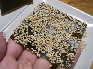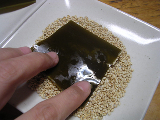 ニセ子持ち昆布が固まるまでの時間を利用して、台所で目についたゴマを付けてみることにした。