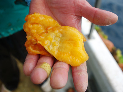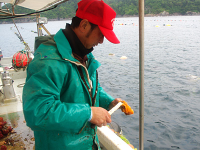 ホヤの引き上げ作業を終えたサイトウさんに勇気を出してお願いしようとしたのだが、それよりも前にホヤを捌きだしてくれた。さすが。
