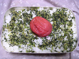 | 菜っぱを敷くと、バングラデシュ国旗弁当になります。 |
