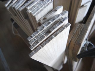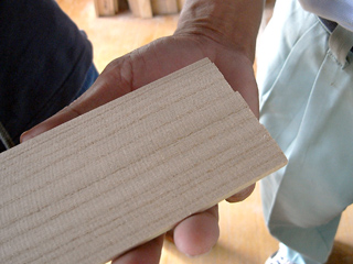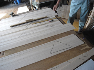 しかし はぎ合わせる前の1つ1つの小さい板も、「まっすぐな」木目だけとは限らない。木目が左右に弧を描いて湾曲していたりする。ならどうするか。こうする。 |