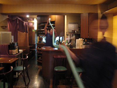 そこで、京菜のフロアマネージャー遠矢さんの登場である。 遠矢さんが腸の中腹を持ち、腸に落差を作る事でビールを大腸まで運ぶのだ。