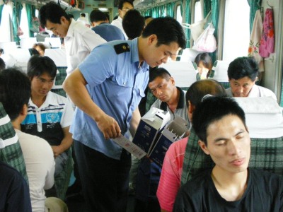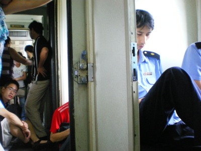 列車は上のランクから個室の車両、2段ベッドの車両、3段ベッドの車両、いい座席の車両、悪い座席の車両とあるが、残念ながら立ち席の切符しか持っていないので、悪い座席の席で立つことになった。立ち席となったのは、席を予約しなかったためで、自分自身の原因でもあるのだが、それにしてもそうした予約しなかった人が車内はすし詰めで大変な混雑っぷりとなっている。