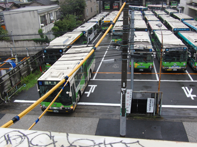 その数分後に隣のバスが出発した。 写真の右側が運行経路なのだが、車庫の出口には電柱が立っており、バスはそれを避けるためにいちど左に回り込んでから出発していった。 そのためのスペースを確保するために最初の一台は左から2列目のバスが出発したのだった。 ちゃんと考えられている。すごい。