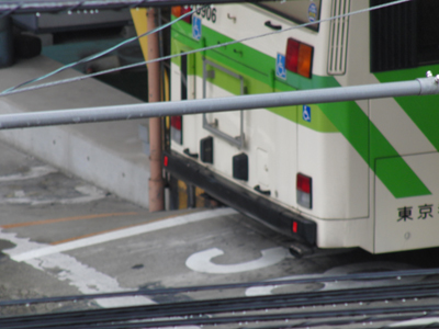 写真右の建物の下に駐車されているバスは、バックで出てきてそのまま転回し、奥のほうへ向かって出発していった。 建物の前にあるバスは、ぐるっとUターンして向こう側へ走って行く。 これもきっとあらかじめそうできるように駐車されているんだろう。
