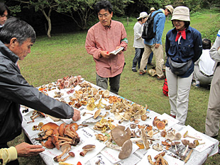 ちょうど疲れてきたところで集合時間になったので集合場所に戻ってみると、すでに会員達がとってきたきのこを所狭しと種類別に並べていた。これがすごい種類と量なのである。
