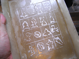 あの型抜き菓子はかなりの固さ、よってここが正念場だ。ラップの上から何度も何度も押し付ける。型はFRP製、ガラス繊維も混ぜてあるのでびくともしない。だいたいいいかなと思ったら、100度のオーブンで型ごと数分乾かす。
