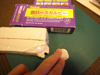 この粘土はその名の通り、オーブンで熱すると「ゴム状」になるという、大変なオモシロ粘土なのである。さあさあ早く練ってオーブンへ!と気がはやるところだが、いかんせん安価なものではないので、小さいサンプルでも作って試してみよう。 |