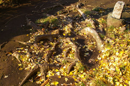 やはりここも根っこがすごくよい。でも、下から見上げた写真も、すごくよい。快晴の冬の日に打ちあがった花火のようにまっすぐ伸びた幹からぱっと開く葉っぱが見えるだろう。