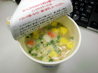 続きましてのやってみたは、投稿コネタであすやんさんからいただいた「シーフードヌードルにクリームパウダーを入れると美味いが寂しい」です。 ネット上での「シーフードヌードルを牛乳で作るとおいしい」という口コミを元に、日清が本当にそれを作っちゃったと話題になった「ミルクシーフードヌードル」をクリームパウダーで作るとおいしいというコネタですが、今回は会社のデスクでできる「やってみた」ということで、オフィスによくあるポーションタイプのクリームで試してみました。