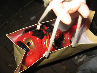 とりあえず撮れそうな小道具を集めてから、そこからネタを出せばいいや、と世田谷のボロ市で天狗の面を購入。住さんからも借りたりあとで買い足したりと合計5つも集まった。こけしも買ったので、べつやくさんに割ろうとしてもらったりした。