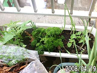 一方その頃、他のプランターも賑やかになる。じゃがいも、パセリ、ネギ、バジル。この辺は種芋や種が残っているのか、毎年なにも撒いていないのに勝手に生えてくる。