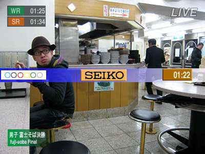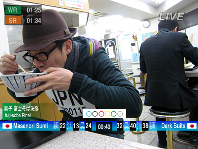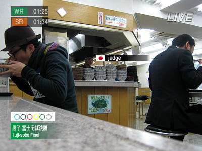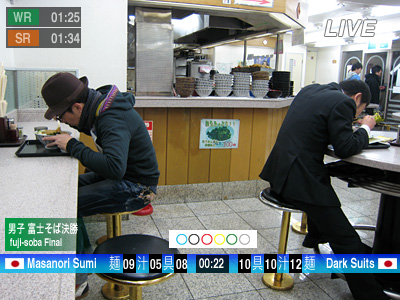 僕と対戦相手は背を向けて座っているので、相手が食べ始めるタイミングが分からない。写真を撮っているスタッフに合図を送ってもらうことにした。相手が食べ始めたら机を叩く。それがスタートの合図である。 |
