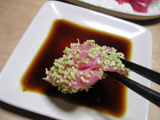 | 僅かに残った分は醤油に付けて単体で。瑞々しくて、ちょっとピリッとしてて、うまい! |