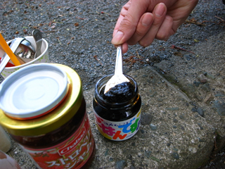 ジャムよりも粘度が低い「ごはんですよ」とハニーディッパーの相性はどうだろうか。 あまり期待せずにすくってみたが、思ったよりはすくいやすかった。 しかし、溝のところにたっぷりと「ごはんですよ」が挟まってしまいお歯黒状態だ。 これはどうしようもない欠点である。 ある側面では利点でも、状況が変わると欠点になることのいい見本ではないだろうか。