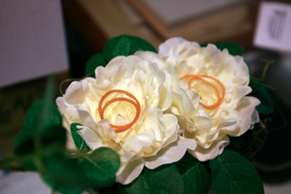 やんなかった企画 「輪ゴムをかわいく収納する」 どれだけ素敵なインテリアの部屋を目指しても、どうしてもスタイリッシュに演出することのできない輪ゴムのかけ場所を工夫することはできないかと何日か考えてみました。 そこで、輪っかモノをもっとも素敵に収納できるであろう、結婚指輪のリングピローに乗せてみましたが、やっぱり輪ゴム以上のものにはならなかったので、あきらめました。