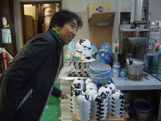 やはり機械よりも職人の腕で貼り合わせていくほうが良いこともあって、安価な商品以外は現在もこのように手作業が主流でございます。玉に、経度ごとに切られた地図を貼り合わせていく作業。この貼り付けの作業はとても集中力を要する作業で、午前中しかしないそうだ。