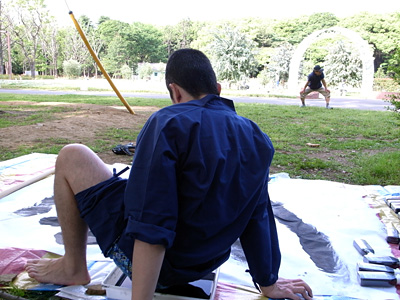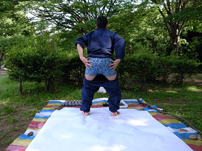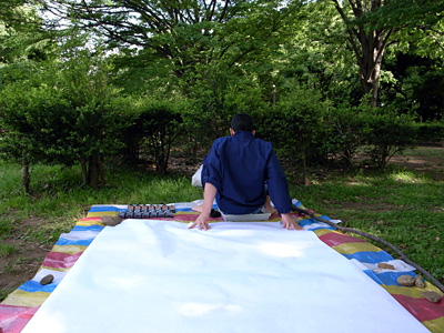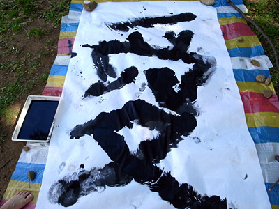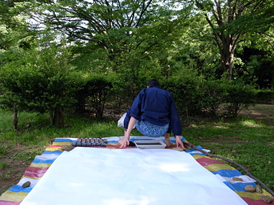 ひんやりと墨汁がお尻にしみ込んでくる。思わず「うわっ」と小さな声が漏れた。