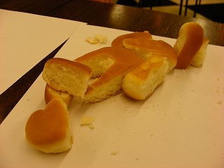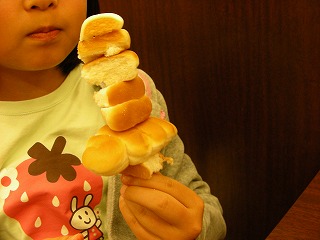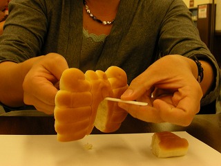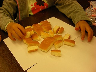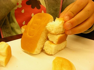 そういうわけで大人もかなり自由なのだが、子供の場合はどうだろうか。ひとしきりパンを食べて満足したのか、いよいよ娘さんも造形すべくパンと向き合いはじめた。