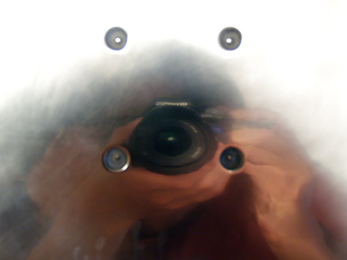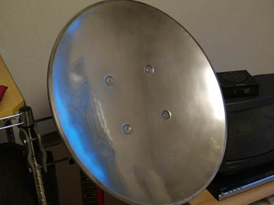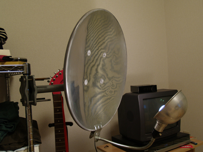 部屋を暗くしてみたところ、パラボラのお皿は光をちゃんと反射している。 写真にするとそうでもないが、実際にはかなりまぶしいくらいに光って見える。 とりあえず、光を反射するという目的は達成しているようだ。