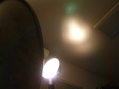 肝心の照明器具としての機能はどうだろうか。 反射したランプの光は、天井に当たっていた。 光が拡散していないので(実際に作ってみると、そりゃそうだよなと納得できた)、天井を照らしても部屋全体が明るくはならない。 ムードのある間接照明だと言い切ればそうかもしれないが、決して実用的ではない。 静かな音楽を聴きながらブランデーを傾けたりすれば、それはそれで風情があるのだろうが、残念ながらそういう贅沢な時間を過ごす習慣はないので、出来上がったはいいがこれをいったいどうすればいいのだろうか。