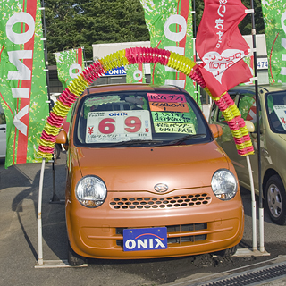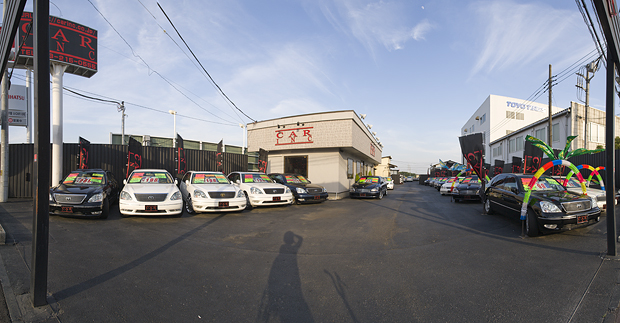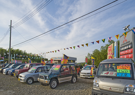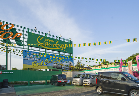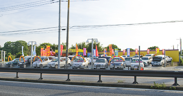 アイレベルはのぼりでにぎやかし、クルマのまわりは花輪で装飾、上空は万国旗で、といったぐあいにとにかくあいている空間は装飾アイテムで埋めよう、という強い意志を感じる中古車屋さん。ふつうのお店と異なり、だだっぴろくなりがちゆえなのだろう。
