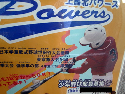 佐藤さんが少年野球の部員募集のポスターを指さした。 |