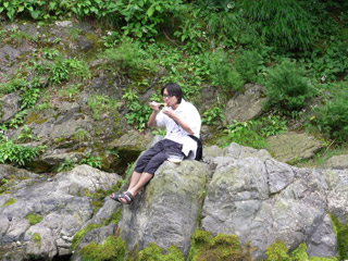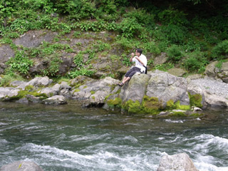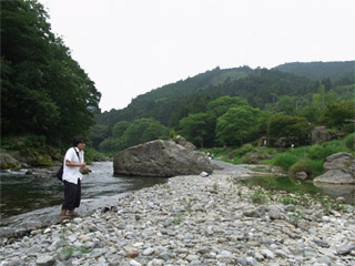 上で流されながらそうめんを食べているけれど、実は流されそうめんを実行するまでにはとても時間がかかった。それは、取材に行った日は、まだ夏ではなくて梅雨真っ只中で天気は曇り、そして上流だったので水が冷たく流されそうめんをしたら寒いことが容易に想像でき、水に入る決心がつかなかったからだ。