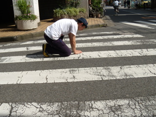 感触は予想通りのものだった。アスファルトはデコボコしていて、だいぶ荒々しい。大根とかショウガがすりおろせそうな手触りだ。横断歩道部分はその上から塗ってあるので、ややフラット。たとえば、道で転ぶようなことがあったら、横断歩道上に膝や手をついたほうが、擦りむけ具合が軽く済むと思う。交通安全だけでなく、転んだ時の安全性まで高めているとは、横断歩道、なかなかニクいやつだ。仕事ができる上に、女性や子どもにもやさしい、できる男みたいだ。