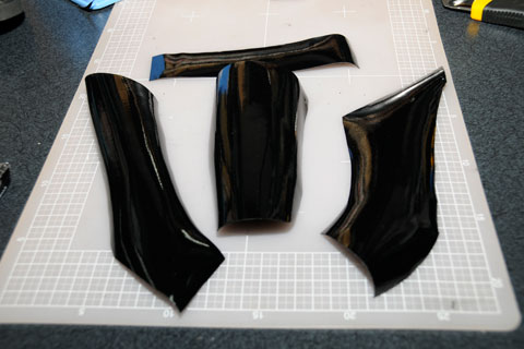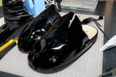 ニセ革靴の材料として、合皮製品などに使われる「ラリッサ」と呼ばれるテカテカの生地を使用。革靴っぽく切り抜いてサンダルに貼り付けていきます。