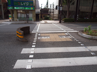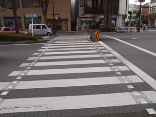 引き続き見つけたコネタを紹介しよう。 甲府駅から駅前通を歩いていると、どの横断歩道にも両端に四角い金属製のタイルが埋めてあるのに気づいた。 何のためにこれがあるのかは謎だが、他では見かけたことがないのでコネタだろうか。 たぶん、安全上の何かなのだと思うが、走る車がみんながたがたと音を立てていてうるさかった。