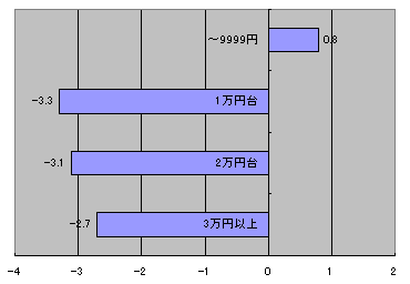 こちらも1万円以上持ち歩いている人の中ではそんなに大きな差が見られなかったが、一万円持ってる人と持ってない人のあいだで大きく開いた。