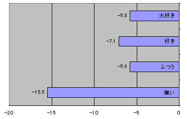 大好き〜ふつうにかけてはあまり差がつかなかったが、「嫌い」グループの過小評価ぶりがすごい。もはやうまい棒は日本人のソウルフードといっても過言ではないと思っていたのだが、この結果からは嫌い派の「俺は認めんぞ」という叫びが聞こえてくるようである。