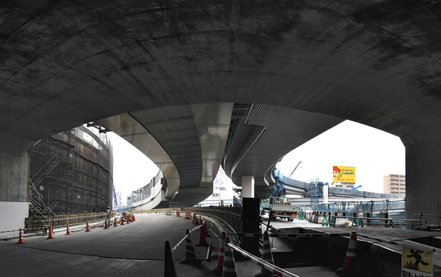 で、盛りだくさんコースは、このあとループの上の方へと進む。246の上を走る既存の高架高速道路へとつながる部分だ。これがまたすごい。