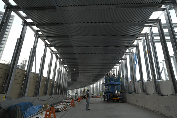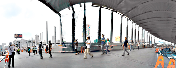 前ページで下から見上げた既存高架高速道路へ続く橋の部分。なんと、今回この上を歩かせてもらったのだ!