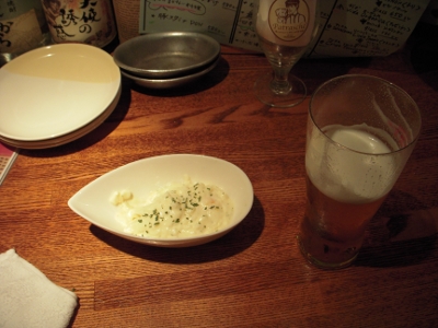 丁寧に入れられたビールになめらかなポテトサラダ。色々な食材が入っていて食感が楽しい。進むビールに弾む会話。