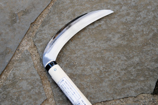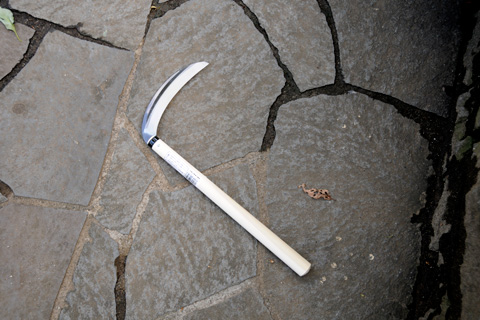 鎌(かま)! 今までの農具は結構大きめだったので取り回しがなかなか難しかったんですけど、この鎌(かま)だったら片手で楽々扱えますし、軽量コンパクトなんでどこにでも持ち歩くことが出来ます。