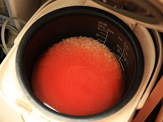 そんな事を思いながら、炊飯器にパプリカ色素を溶かした水を投入。なんだかやっちゃいけないことをしてるような赤っぷりに。