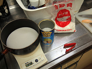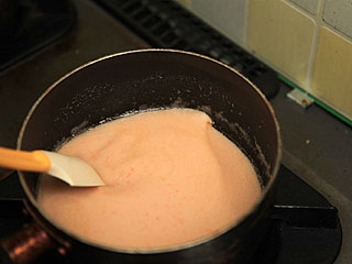 材料はココナッツミルク200gに砂糖20g。ココナッツミルクを1缶丸ごと使う場合は、ココナッツミルクが400gになるので砂糖は40g。鍋で加熱して砂糖を溶かし、色素で赤くしたら冷凍庫へ。氷かけに三回ほど攪拌してやれば出来上がり。うむ、簡単だ。そして、赤い。