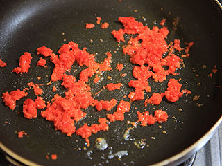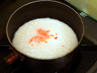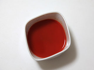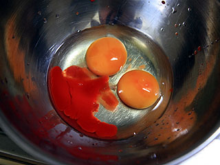 卵2個にパプリカ汁を少々。生玉子と赤い汁を合わせると、なんとも言えない妙な写真になることを発見。