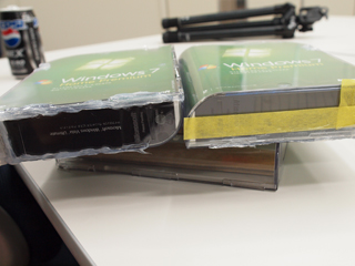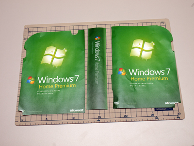 プリントアウトしたWindows7のパッケージ画像を、それらしい体裁に切り抜いた。 このへんのごまかしテクニックは、得意なほうである。 しかし、Windows7の予約販売開始を告知する記事で、こんな、考えようによっては、ややいんちきっぽいことをしてしまっていいのだろうか。