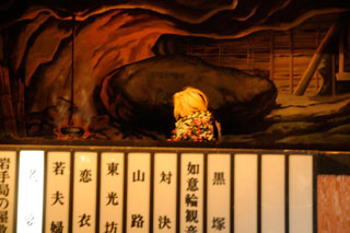 菩薩様の矢に射貫かれて最期の時を迎えるオニババも菊まみれ。菩薩様の方こそ菊が似合うような気がしますが、なぜかそっちは書き割りです。