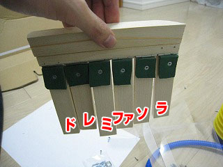 とりあえず1オクターブ鳴ればいいかな、と思っていたのだが、買ってきた木をそのままの幅で使ったら、ドレミファソラまでしか置けなかった。あまりの行き当たりばったりぶりに自分でも驚いた瞬間である。