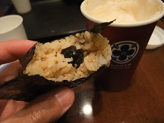 この店はドリンクの他に丼物やおにぎりも提供。中でも気になった「エダムチーズおにぎり」を食べてみた。決して奇抜な味ではなく、チーズのコクがごはんとよくなじんでおいしい。そして食べ進むうちに中から黒いものが。ちょっとかじってみると、正体はオリーブの実と判明。