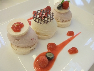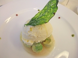 いろいろある中、最も不思議な感じがした「リッチミルクアイスクリーム、白桃のコンポートとフレッシュアボカド添え」を選んでオーダー。メニューの説明に「胡椒とゲランドの塩、オリーブオイルで仕上げました」とあるのが気になった。