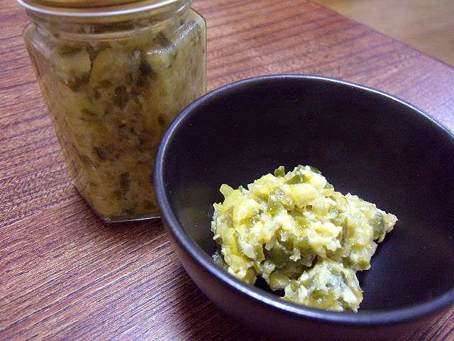 柚子胡椒よりかかなり白っぽいです。そして、皮の水分が少ないのか、柚子胡椒よりかはパラパラしています。食べてみると、スダチのよい香りはするけれども、かなり淡いです。辛さに関しては柚子胡椒同様にピリッと辛く後をひく。全体的にサッパリしています。そのまま食べる分にはちょっと物足りなさを感じます。