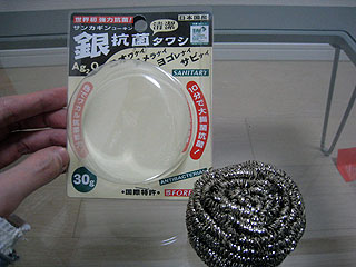 この金タワシ、酸化銀を使った抗菌仕様である。抗菌自体には今は興味はないが、他にはなかった金属なので違った結果が出るかもしれない。ビリッといってくれ!