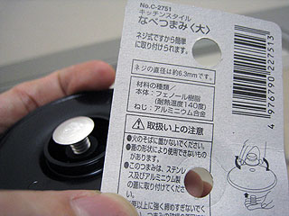 鍋のフタの交換用ツマミ。ネジに金属が使われていたので買ってきた。こちらはアルミホイル合金と書いてあって、アルミとは少し違うようだ。