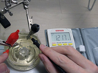 ネジだけ外して電池にして計ってみると、0.339ボルト。アルミホイルを下回る結果。どうもアルミ系は相性がよくないのかもしれない。